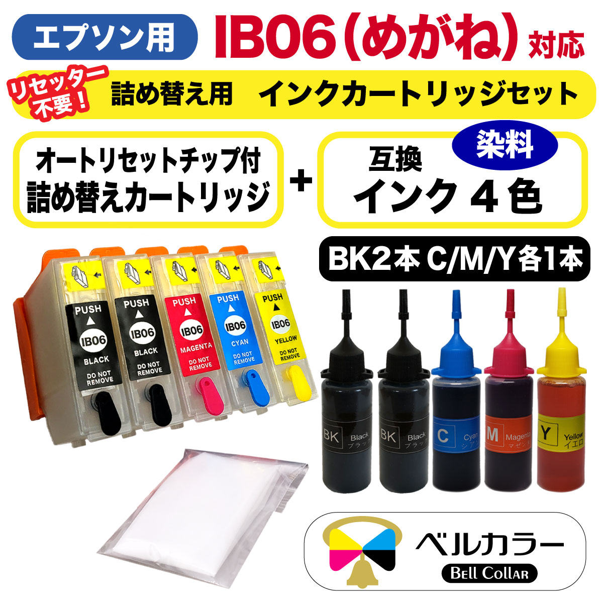 エプソン互換 IB06 めがね 対応の詰め替え用互換インク4色(ブラック30ml×2本、シアン・マゼンタ・イエロー各30ml)と詰め替えインクカートリッジ(自動リセットチップ付き)のセットです。