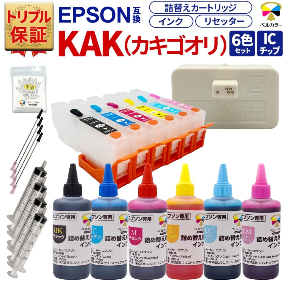 エプソン KAK ( カキゴオリ ) 対応 詰め替えカートリッジ / 詰め替え互換インク6色 / ICチップリセッターのセット商品です。インク容量は純正比約7倍で非常にお得です。