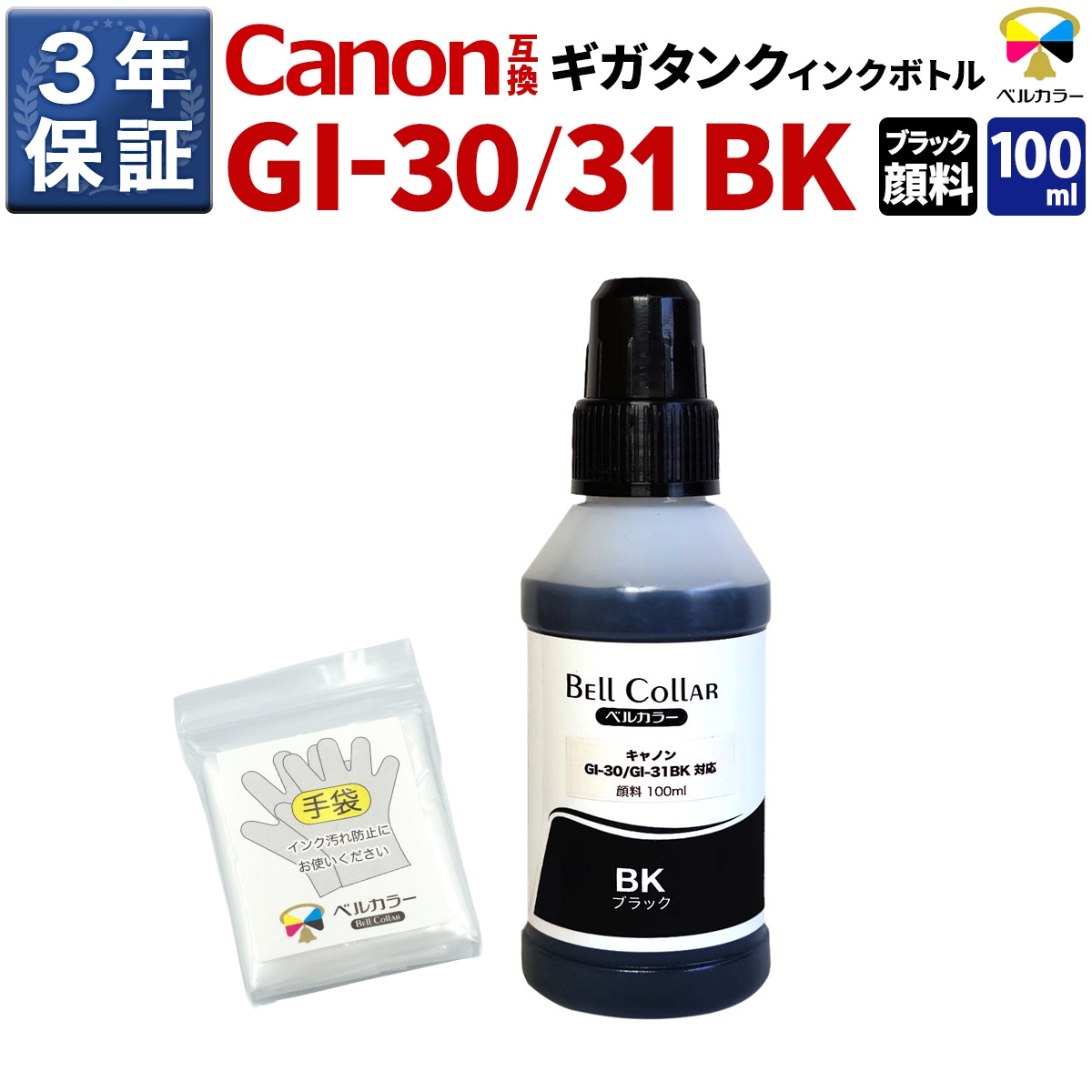 GI-30 / GI-31 キヤノン Canon G3360 / G7030など 対応 互換インクボトル ブラック 顔料 100ml ギガタンク搭載モデル ベルカラー製