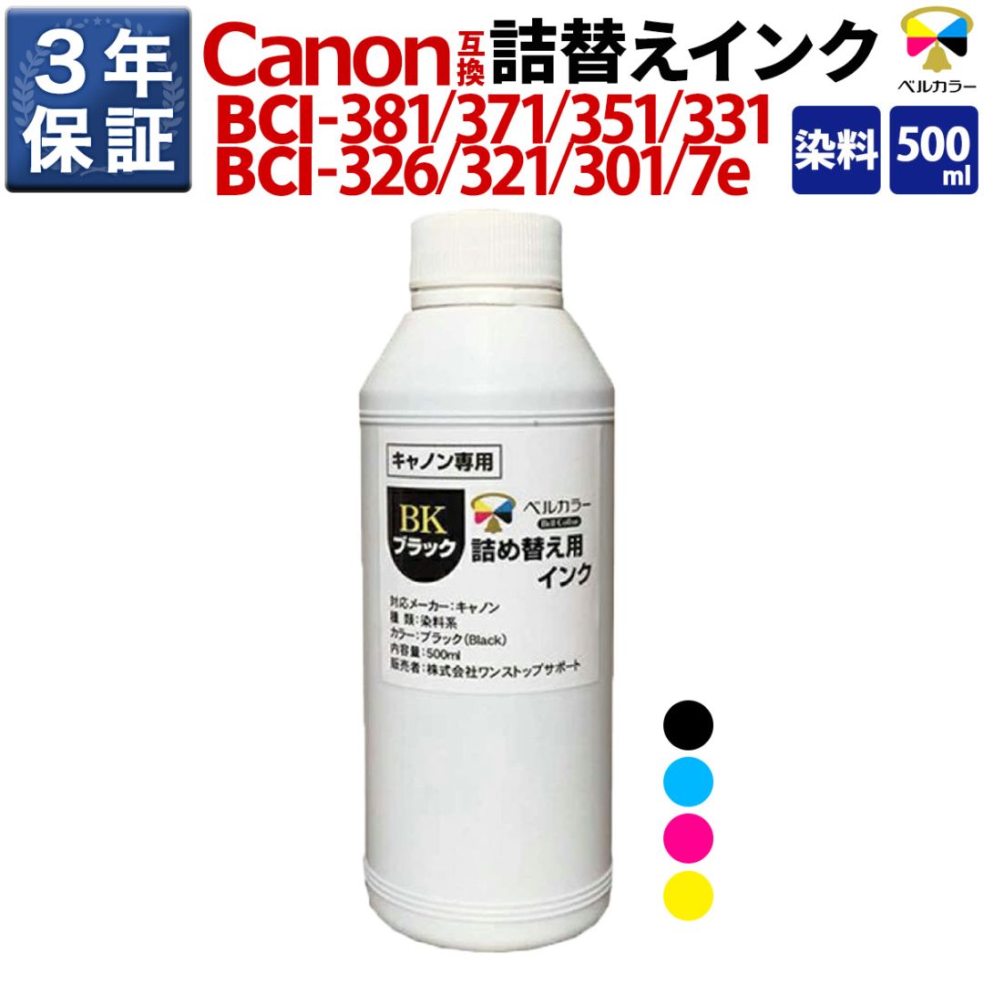TN-395 キヤノン Canon BCI-330 / 331など 対応 互換 詰め替えインク 500mlボトル単品 ブラック(染料系)、シアン、マゼンタ、イエロー選択 3年保証 ベルカラー製
