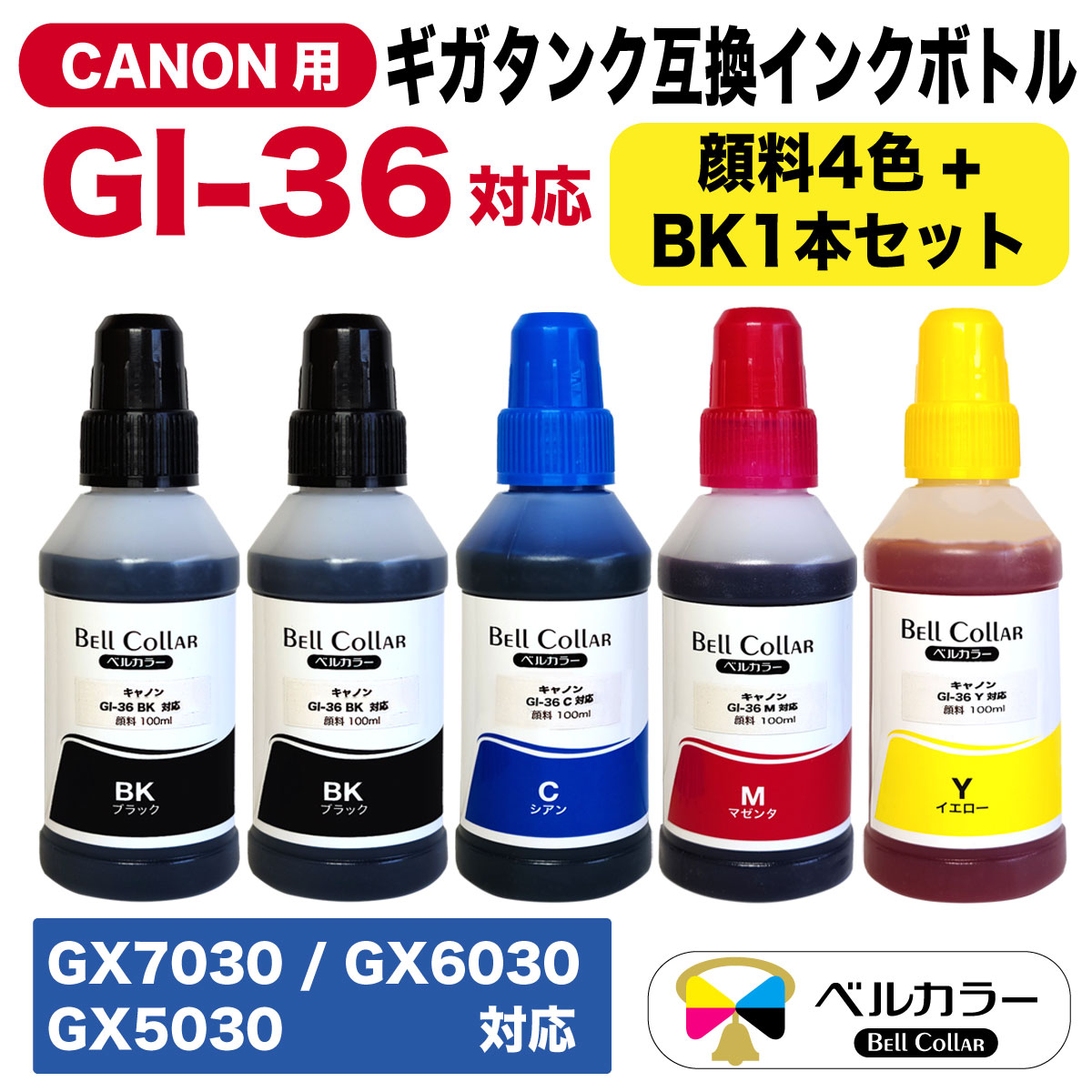 GI-36 キヤノン Canon GX7030 / GX6030 / GX5030 互換 インクボトル 顔料ブラック、シアン、マゼンタ、イエロー 4色 + BK 1本セット ベルカラー製