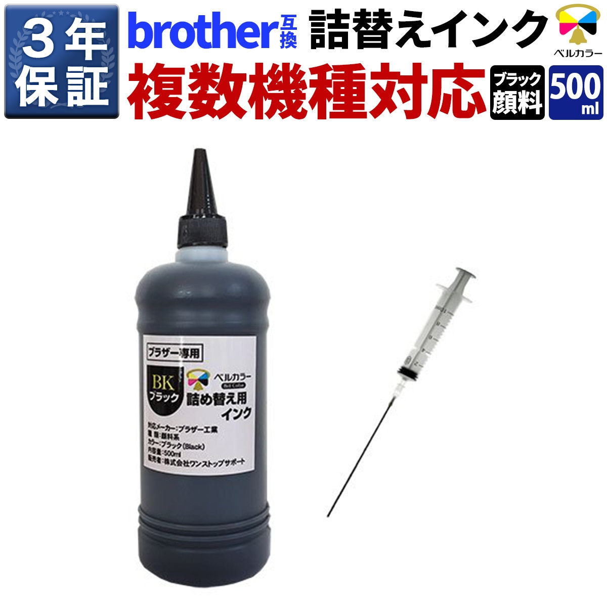 LC11 / LC12 ブラザー BROTHER MFC-6890CN / MFC-6490CNなど 対応 詰め替えインク ブラック顔料 500ml 詰め替え器具一式 3年保証 ベルカラー製