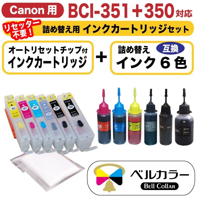 キヤノンBCI-351・350シリーズ対応の、詰め替えカートリッジ(自動リセットチップ付き、スケルトンタイプ)と互換インクの6色セット商品です。純正インクの約5倍の容量で非常にお得です。