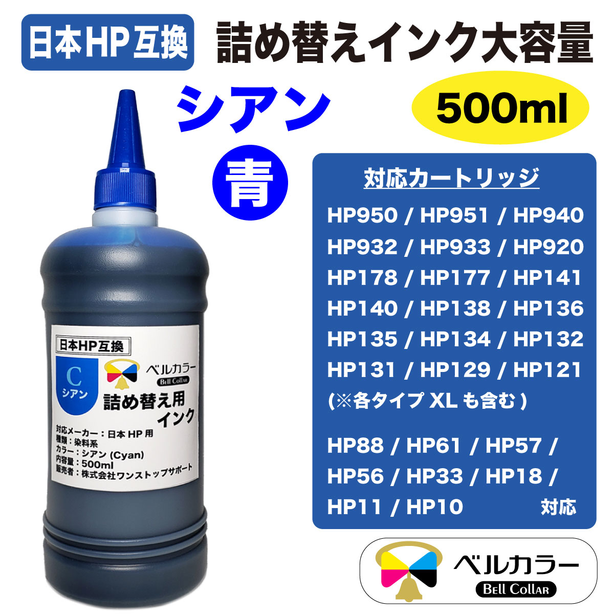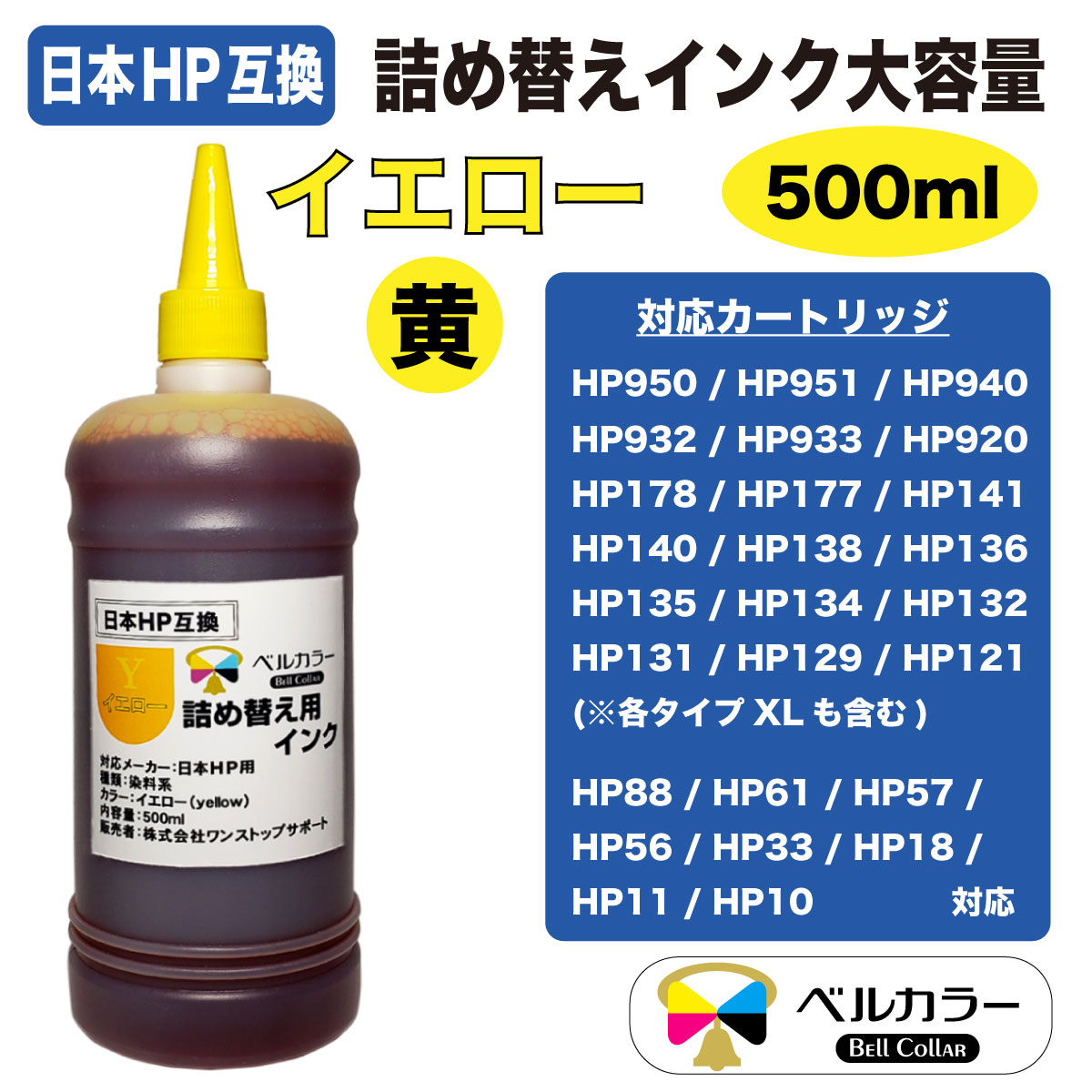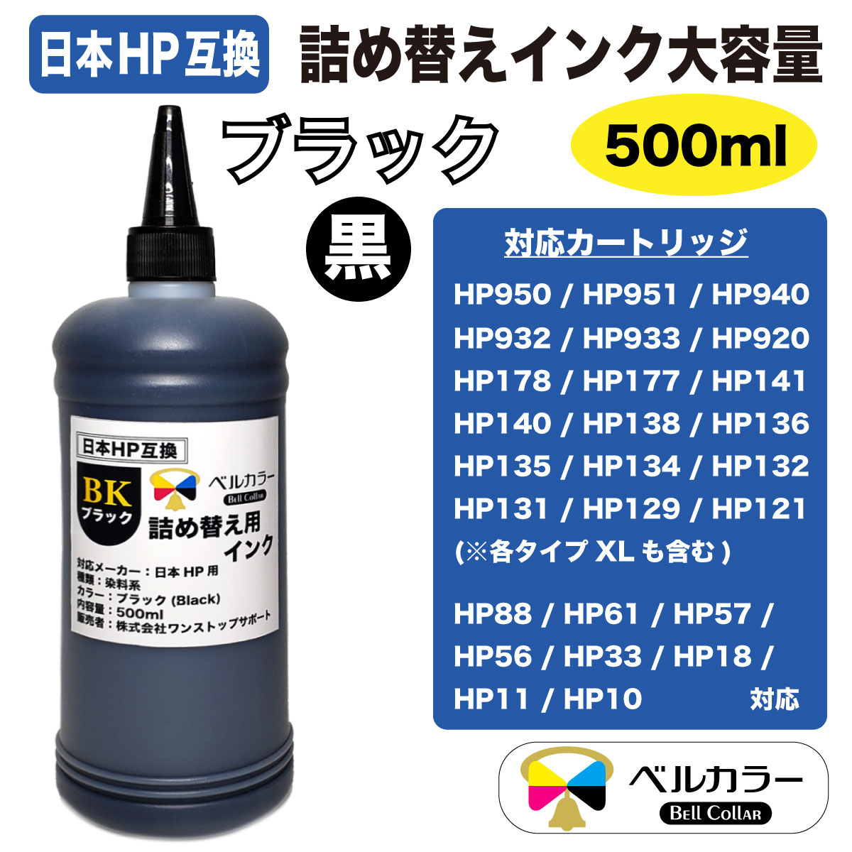 HP951/HP920/HP138/HP136/HP135/HP134 ヒューレット・パッカード HP 詰め替え互換インク 500ml 顔料 単品 4色選択 3年保証 ベルカラー製